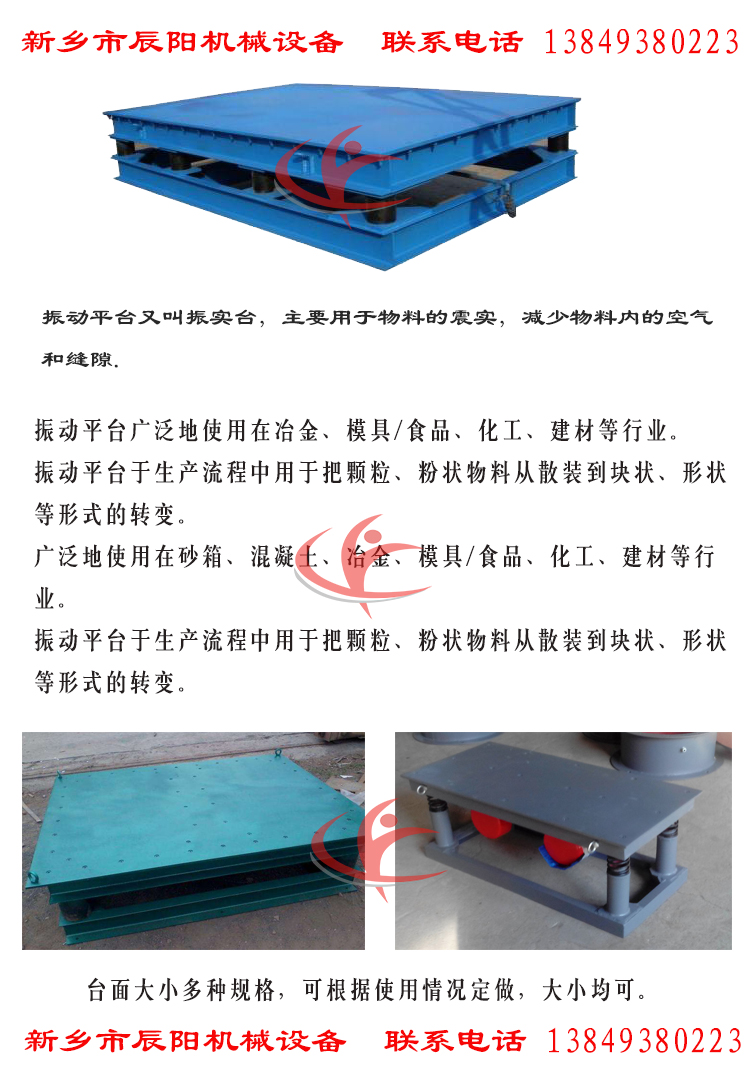振動平臺又叫振實臺,主要用于物料的振實,減少物料內(nèi)的空氣和縫隙。振動平臺廣泛使用在預制件、人防工程門、混泥土、消失模、冶...